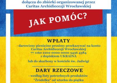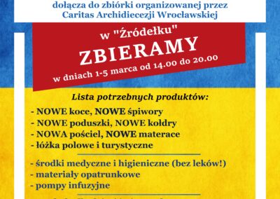 Prosimy o zbiórkę konkretnych artykułów (lista wywieszona w gablocie i w internecie). Dary najlepiej dostarczyć w poniedziałek i wtorek między 14.00 a 20.00 do Źródełka. Zebrane dary dzielimy między osoby przyjęte do rodzin w naszej parafii, uchodźców w noclegowaniach na terenie Wroclawia oraz Caritas.