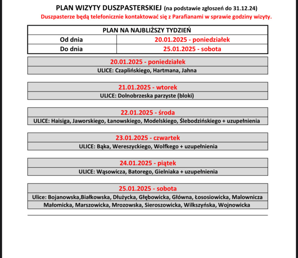3. W styczniu z racji na Kolędę – Wizytę duszpasterską, kancelaria parafialna we wtorek, środę i czwartek popołudniu będzie nieczynna. Ważne sprawy będzie można załatwić po Mszach wieczornych.