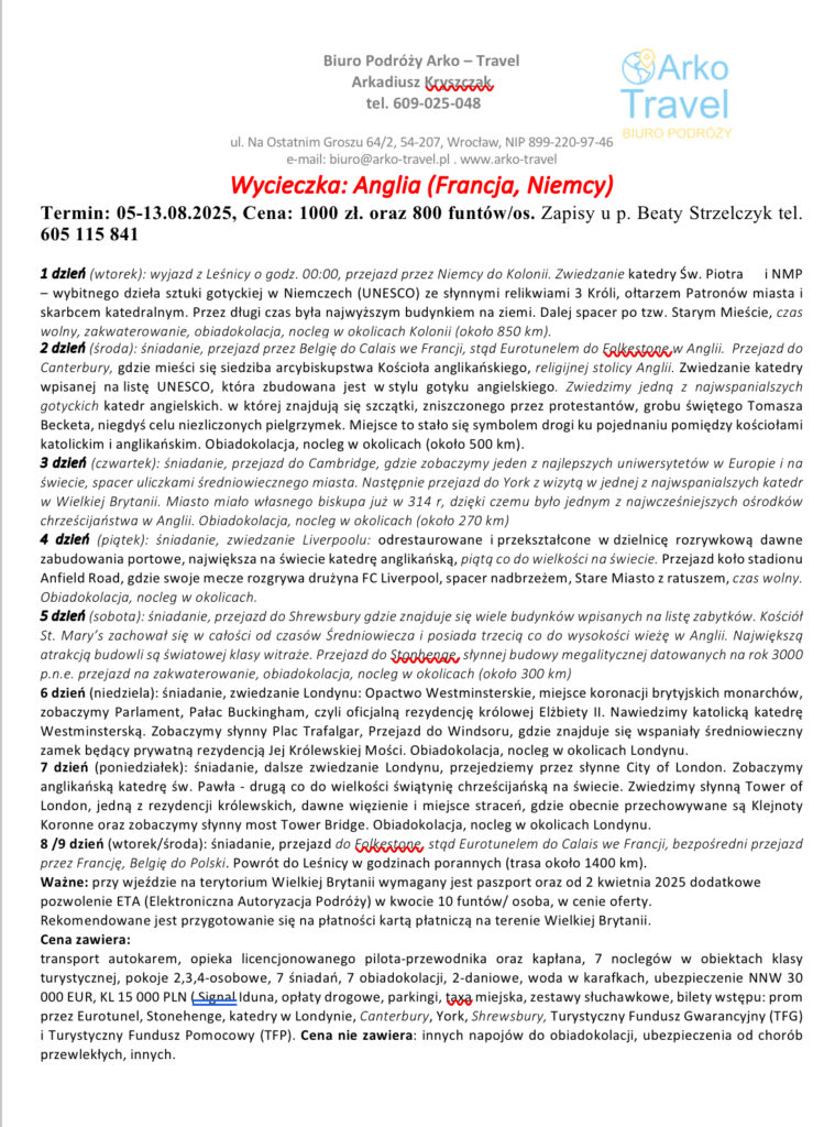 - Zapraszamy na wycieczkę parafialną do Anglii szlakiem najstarszych zamków i katedr. Termin 5-13 sierpnia. Koszt 1000 zł oraz 800 funtów. Potrzebny paszport. Plan na stronie internetowej i na FB parafii oraz w zakrystii. Zapisy u p. Beaty Strzelczyk tel.605 115 841