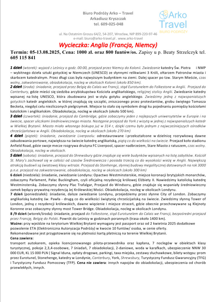 8. Zapraszamy na wycieczkę do Wielkiej Brytanii szlakiem najstarszych zamków i katedr. Termin 5-13 sierpnia. Koszt 1000 zł oraz 800 funtów. Potrzebny paszport. Plany na stronie internetowej i na FB parafii. Zapisy u p. Beaty Strzelczyk tel. 605 115 841