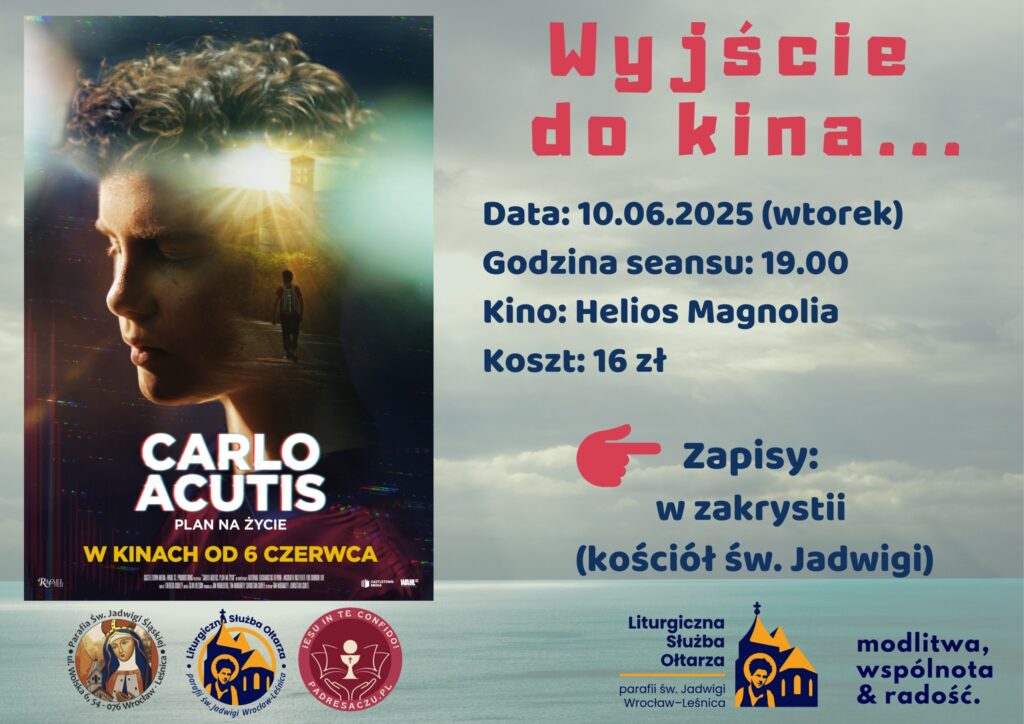 - Kolejne parafialne wyjście kulturalne we wtorek 10 czerwca o godz. 19:00 w kinie Helios w Magnolii. Zachęcamy do obejrzenia filmu „Carlo Acutis – Plan na życie”. Zapisy w zakrystii. Koszt 16 zł. Dojazd we własnym zakresie.