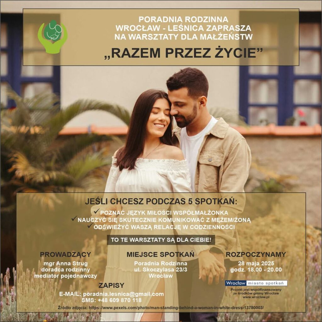- Poradnia Rodzinna zaprasza na bezpłatne warsztaty dla małżeństw, które rozpoczną się w najbliższą środę w sali za kościołem św. Krzyża o godz. 18:00. Warsztaty to pięć spotkań o miłości w codzienności, komunikacji, rozwiązywaniu konfliktów, intymności, językach miłości i wielu innych tematach. Zapisy drogą mailową poradnia.lesnica@gmail.com i telefonicznie 609 870 118.