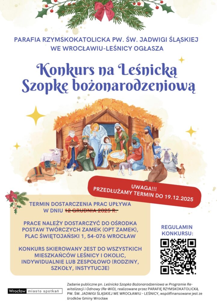 Serdecznie zapraszamy do wzięcia udziału w konkursie na Szopkę bożonarodzeniową z motywem leśnickim, organizowanym przez Parafię Rzymskokatolicką pw. św. Jadwigi Śląskiej we Wrocławiu-Leśnicy.