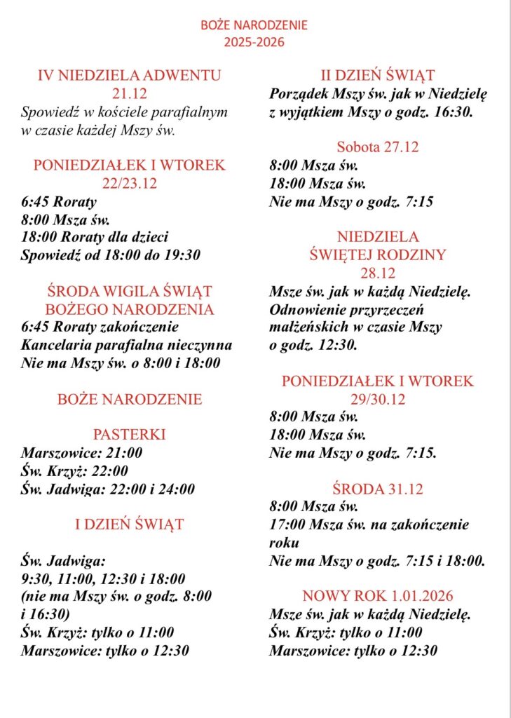 - W II dzień Świąt porządek Mszy św. jak w Niedzielę z wyjątkiem Mszy św. o godz. 16:30.