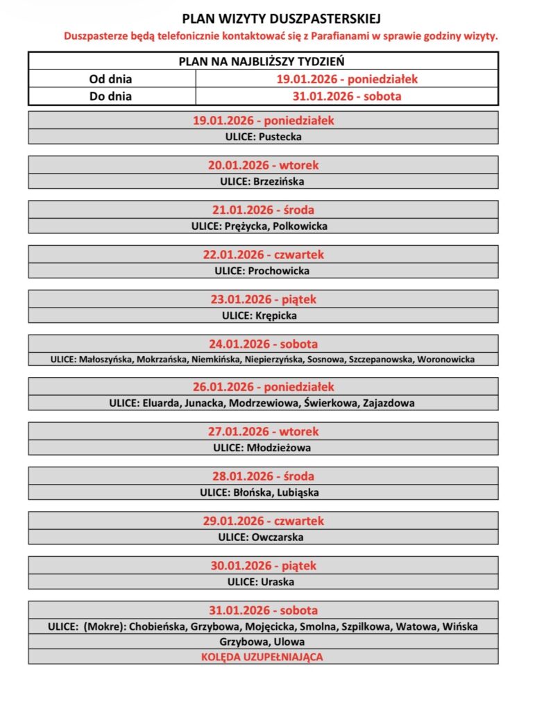 6. Kończymy w tym tygodniu Wizytę Duszpasterską tzw. Kolędę. Przypominamy, że w dzień poprzedzający Kolędę, zostanie wysłany sms z informacją o przybliżonej godzinie odwiedzin księdza. Jeżeli do godz. 20:00 rodzina nie otrzyma smsa a zapraszała w minionych latach, prosimy o wiadomość smsem na numer 515 200 935.