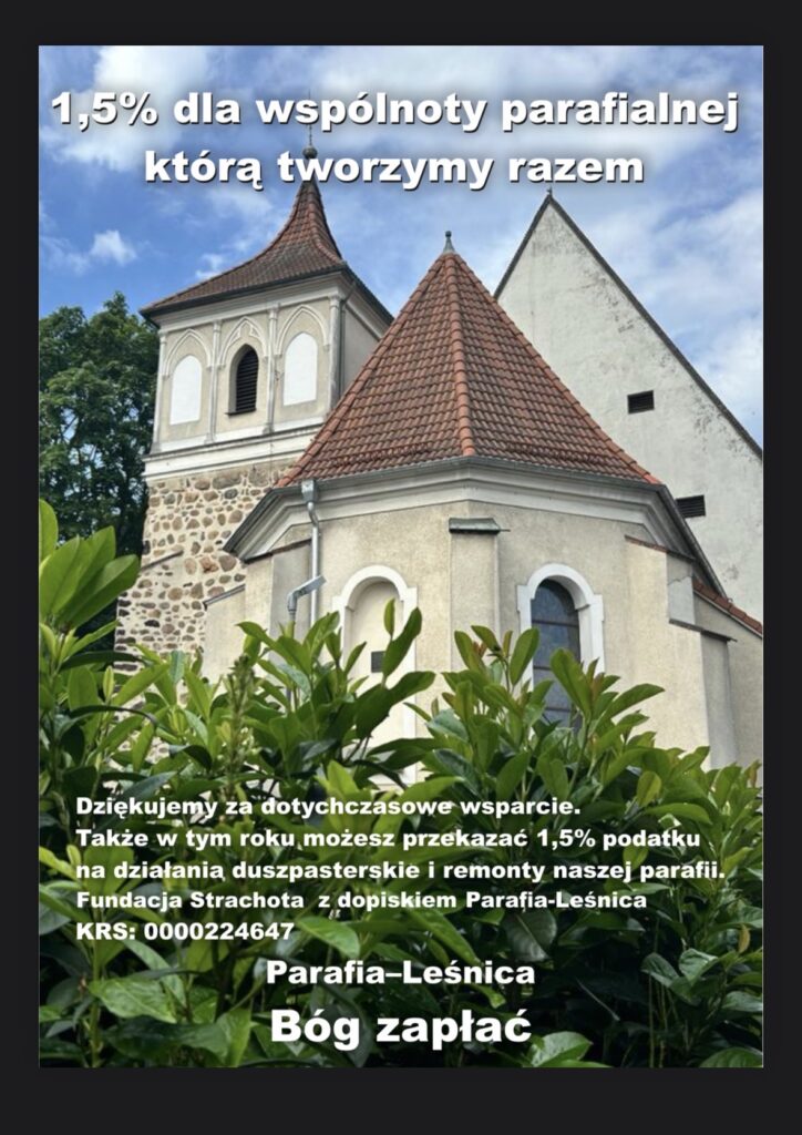 - Dziękujemy wszystkim, którzy w minionych latach przekazywali 1,5% swojego podatku na rzecz naszej parafii. Przypominamy, że w tym roku można również to uczynić wspierając tym samym naszą parafię w podejmowanych działaniach duszpasterskich i remontach. 1,5% podatku można przekazać za pośrednictwem Fundacji Strachota, wpisując numer KRS 0000224647 z dopiskiem Parafia-Leśnica. Bóg zapłać za wsparcie.