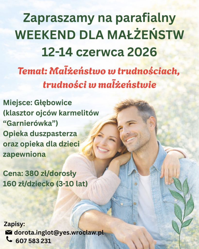 10. Zapraszamy małżonków na coroczny parafialny wyjazd „Weekend dla małżeństw”, który w tym roku będzie miał tytuł: „Małżeństwo w trudnościach. Trudności w małżeństwie.” Termin: 12-14 czerwca. Miejsce: Garnierówka k. Wołowa. Zapewniona opieka dla dzieci.  Szczegółowe informacje i kontakt do zapisów na plakatach i portalach społecznościowych.
